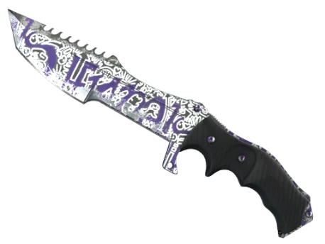 A knife designed for modern tactical uses, the blade is well suited for a range of both combat and utilitarian needs. The unique Tanto point allows for maximum penetration through even the toughest of surfaces. It has been painted black and purple, then decorated with a metallic marker.
